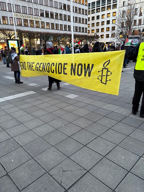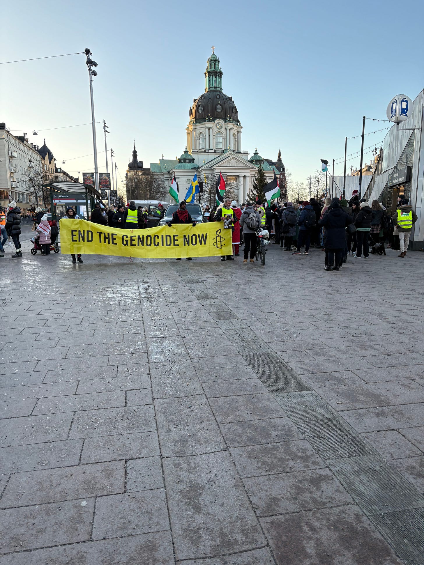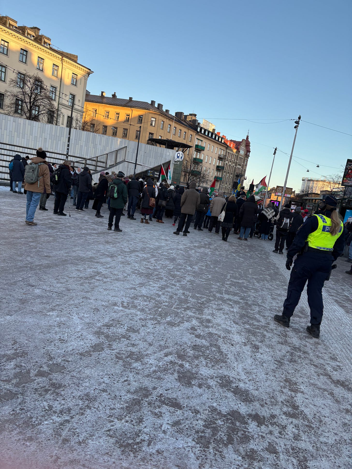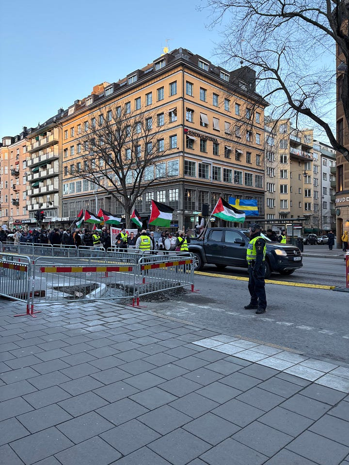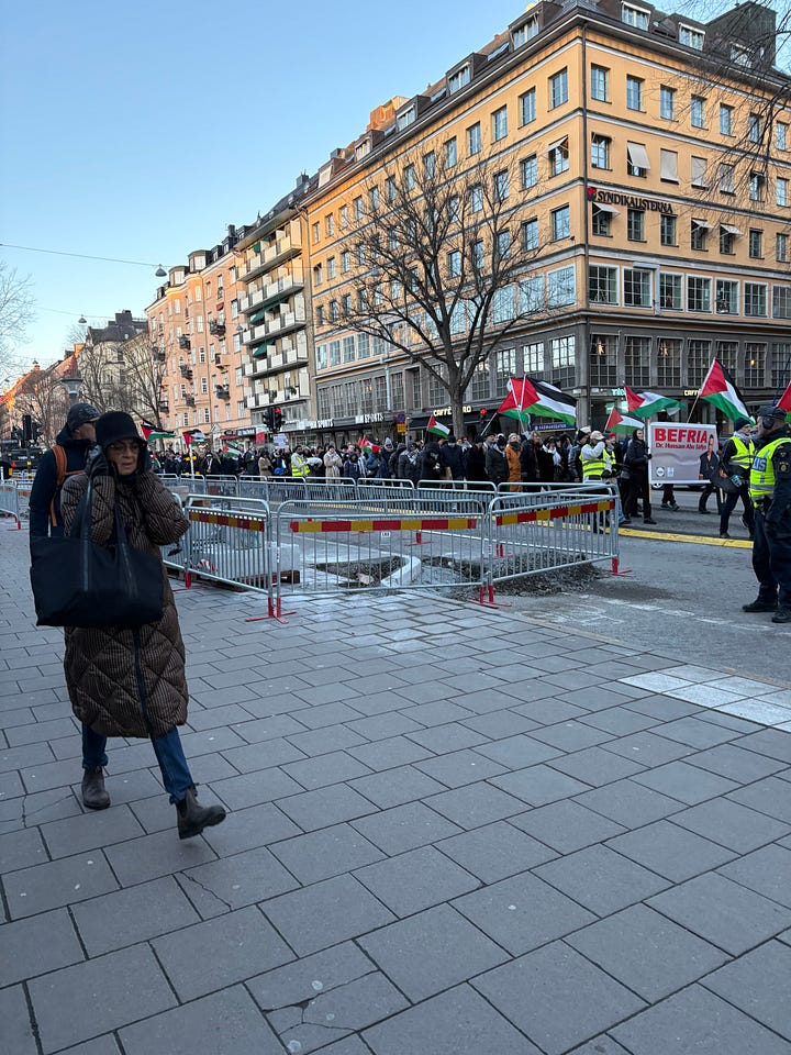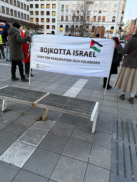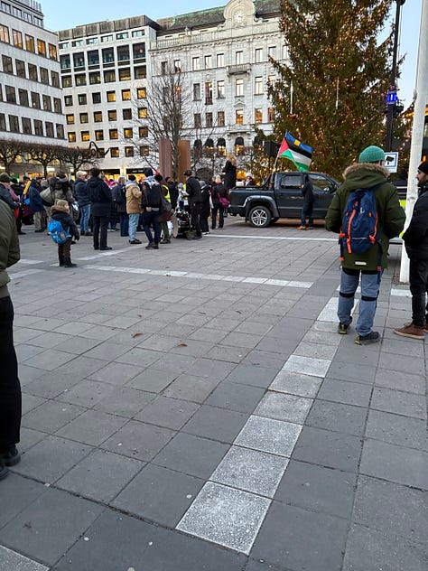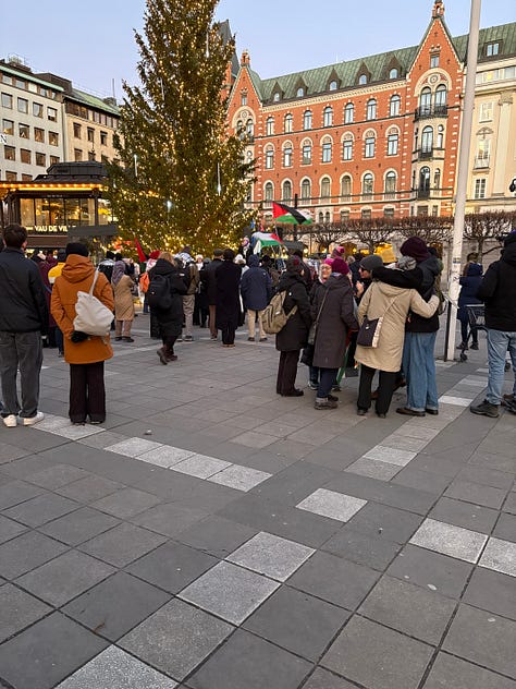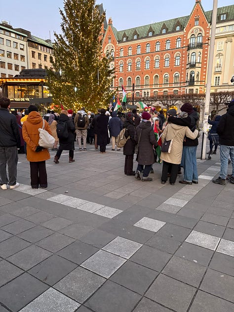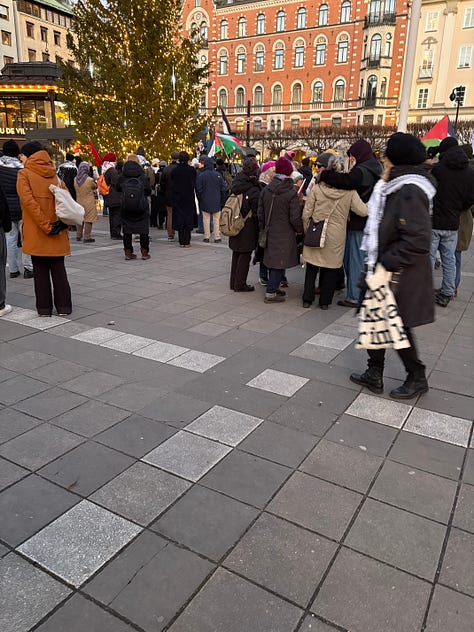 Det är december i Stockholm, solen lyser men det är bitande kallt. Människor börjar samlas under flaggor som inte är våra. Jag står en bit bort, med en macka från Subway i handen, ser hur ett hundratal aktivister anländer i små grupper, hälsar på varandra, vecklar ut banderoller. Klockan är strax efter ett. Ur högtalarna spelas palestinska popdängor med refränger som “from the river to the sea”, ord som för många låter som en sång, men som för andra betyder något helt annat.