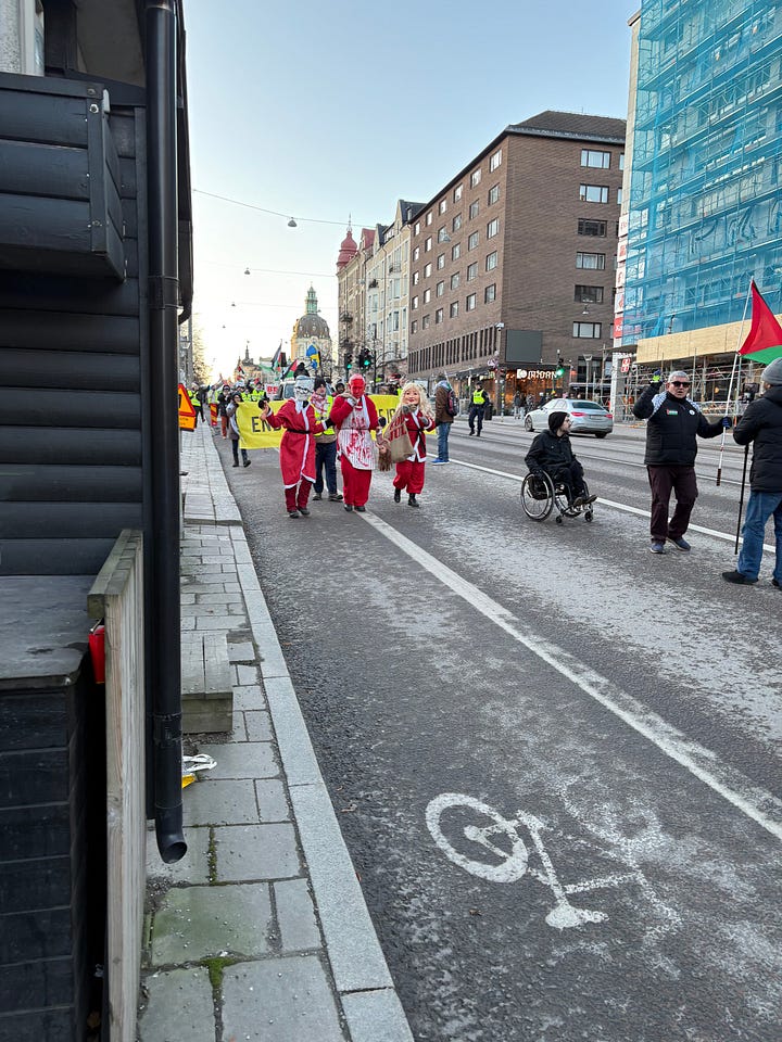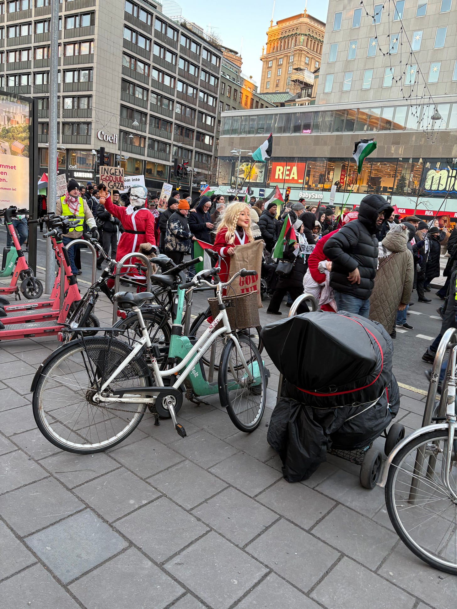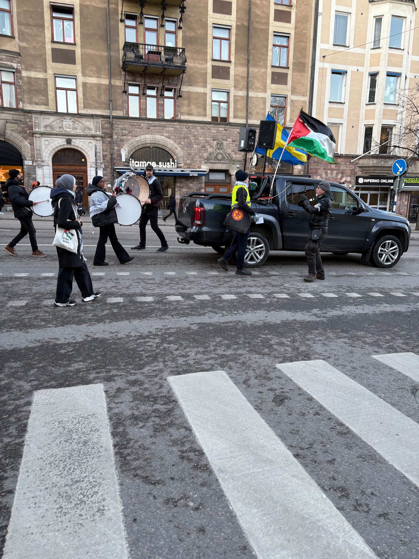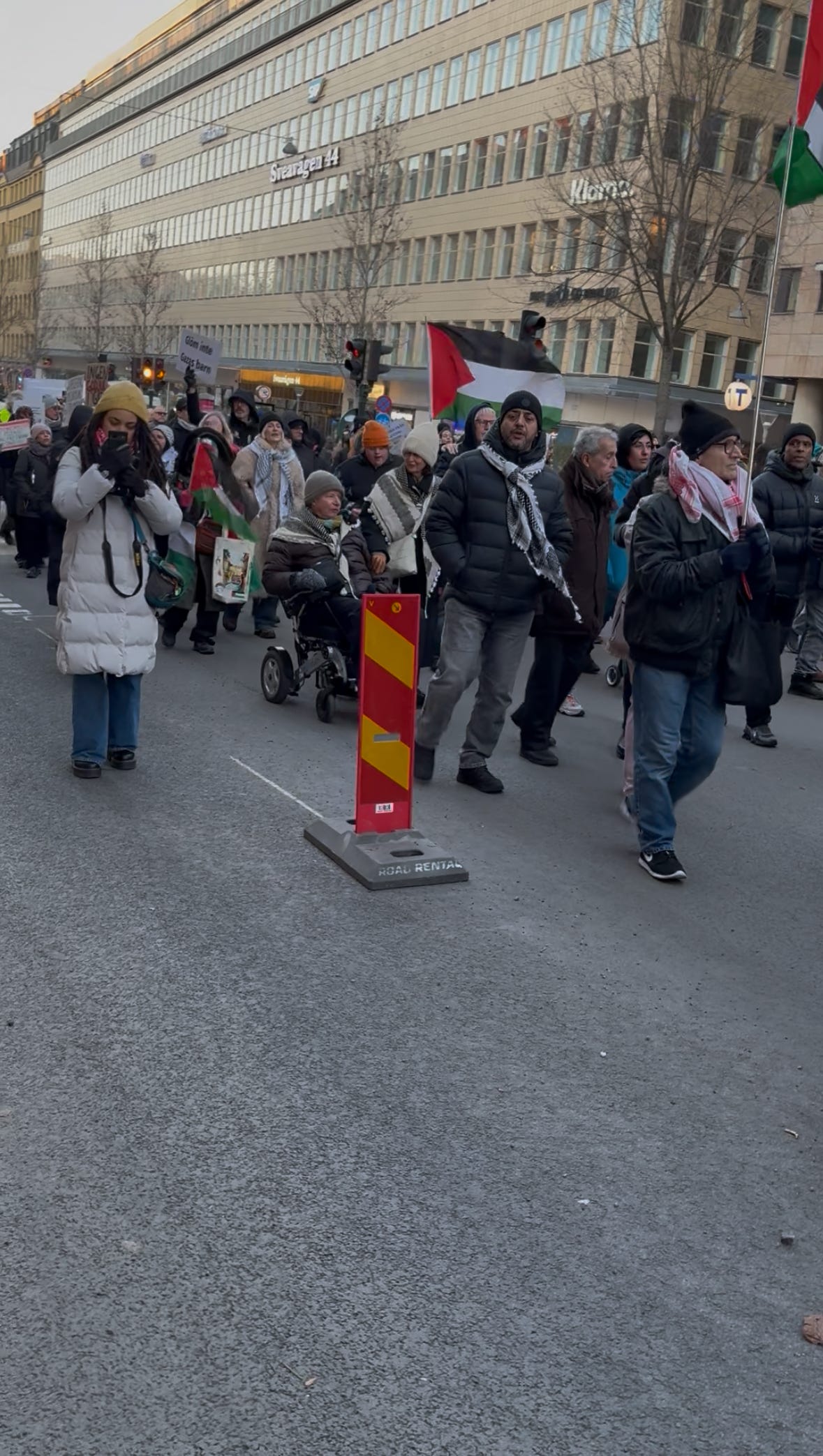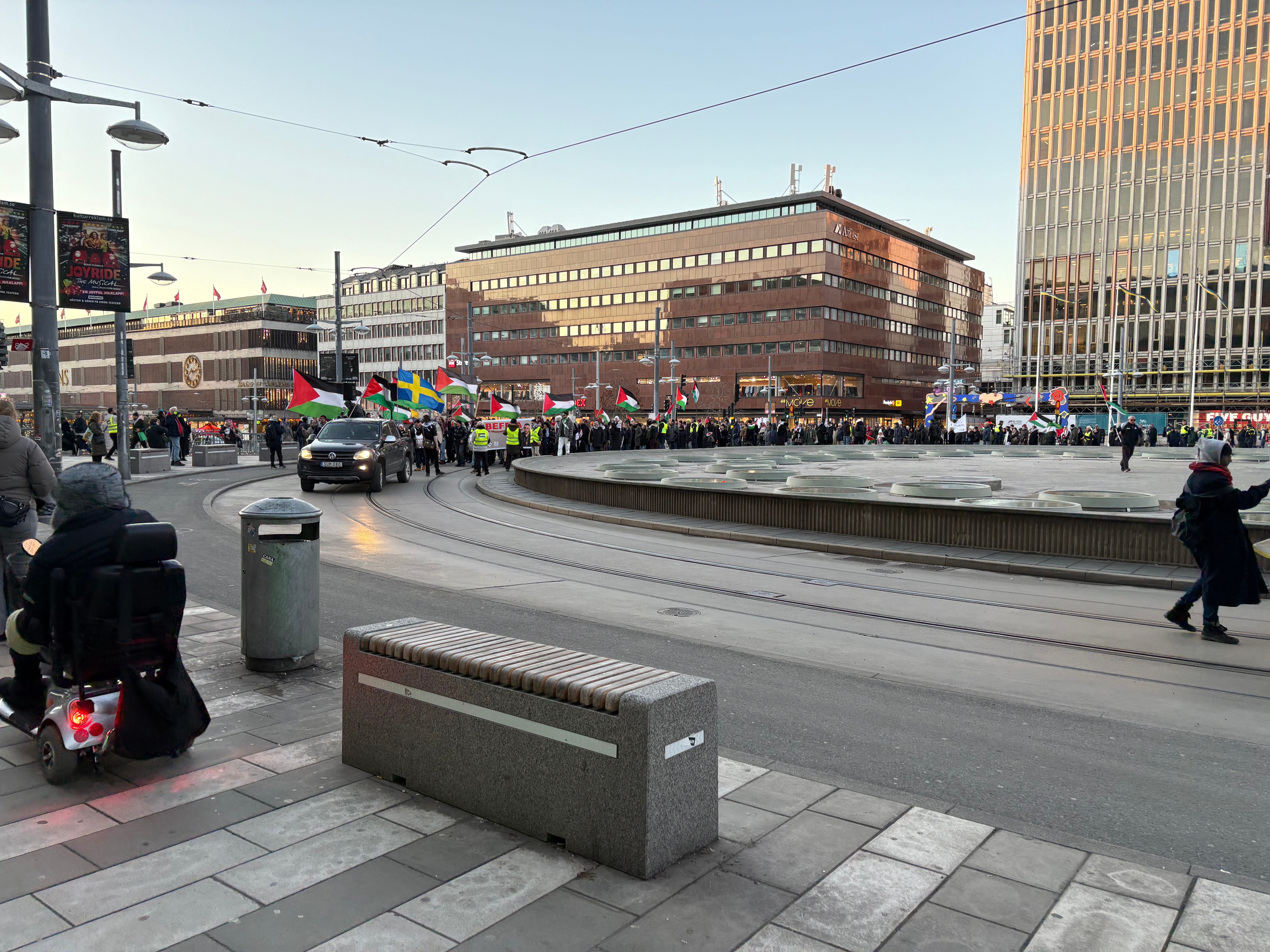 Det är december i Stockholm, solen lyser men det är bitande kallt. Människor börjar samlas under flaggor som inte är våra. Jag står en bit bort, med en macka från Subway i handen, ser hur ett hundratal aktivister anländer i små grupper, hälsar på varandra, vecklar ut banderoller. Klockan är strax efter ett. Ur högtalarna spelas palestinska popdängor med refränger som “from the river to the sea”, ord som för många låter som en sång, men som för andra betyder något helt annat.
