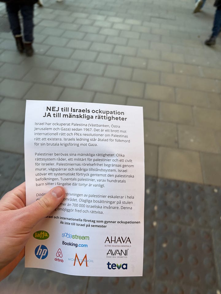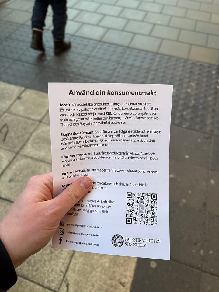 Någon delar ut broschyrer vid Kungsträdgården, andra ropar om bojkott av Israel. “För att inte bidra till folkmord”, förklarar en kvinna med allvarlig röst.