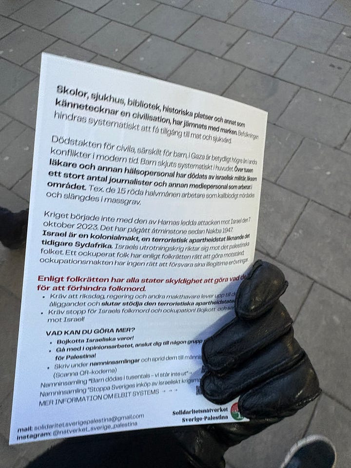 En annan man går fram, frågar vad jag “tycker om folkmordet”. Jag svarar lugnt att jag fokuserar på svenska frågor. Han nickar, men jag ser på honom att svaret irriterar.